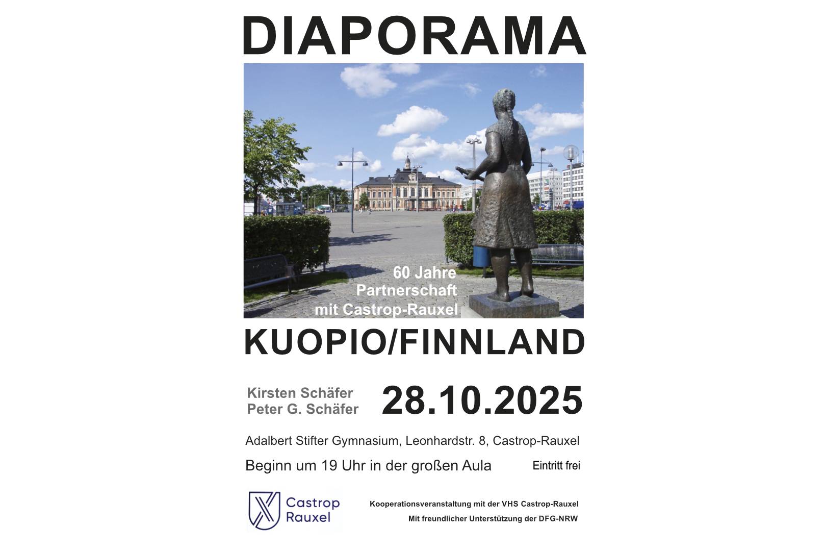 Aus Anlass des Jubiläums nimmt die Deutsch-Finnische Gesellschaft Castrop-Rauxel e.V. Interessierte am 28. Oktober in der großen Aula des Adalbert-Stifter-Gymnasiums ab 19.00 Uhr im Rahmen einer musikuntermalten Bilderschau mit auf eine Reise in das gut 2.500 Kilometer entfernte Kuopio. Die Grußworte zur Jubiläumsveranstaltung sprechen die stellvertretende Bürgermeisterin Katrin Lasser-Moryson und die erste Vorsitzende der DFG NRW e.V. Elfi Heua. Der Eintritt ist frei.